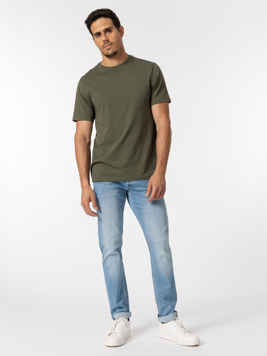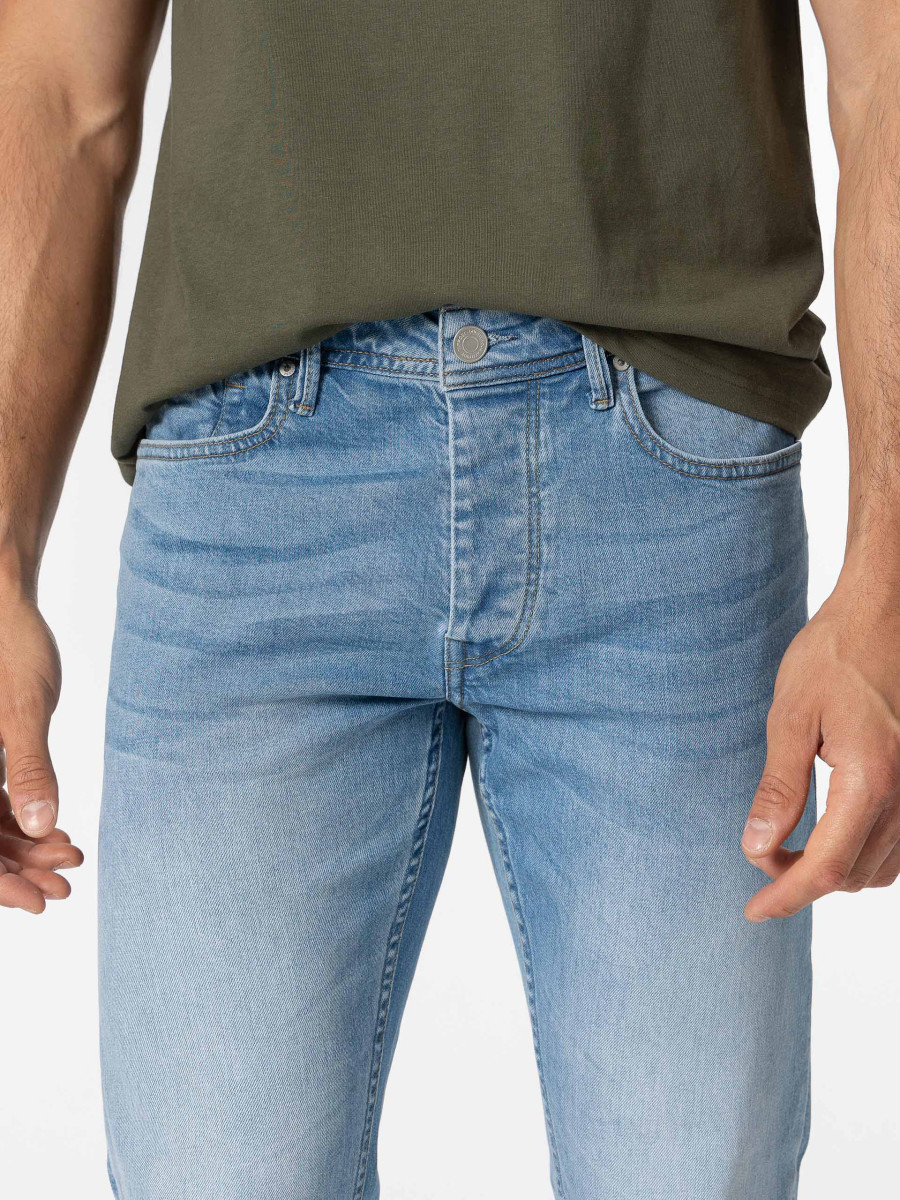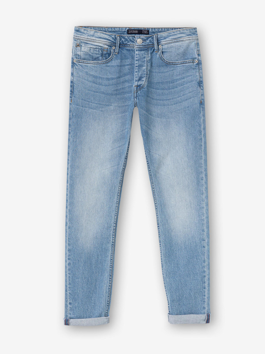 Click/Touch to zoom image Tapered fit jeans with five pockets. Front closure with hidden flap buttons and metal button. Model height: 188 cm | Size: 32