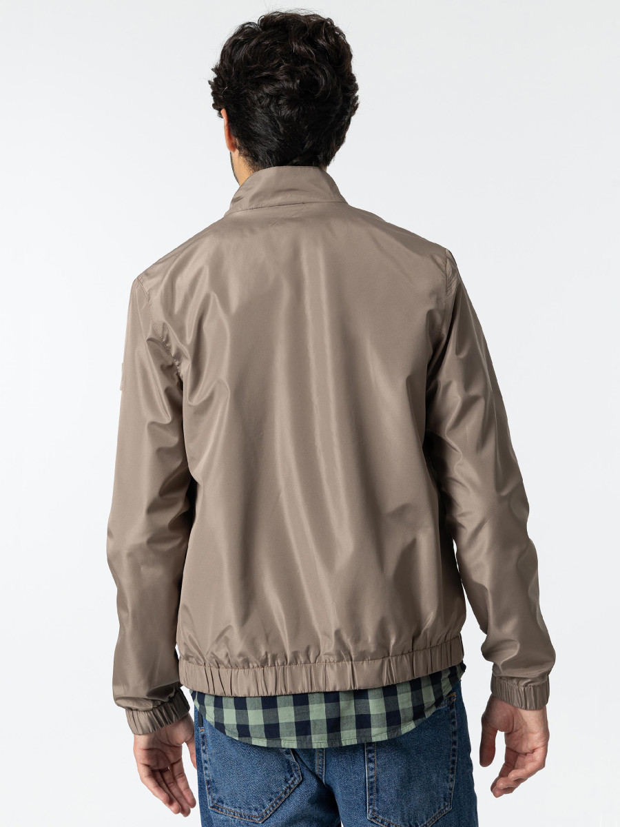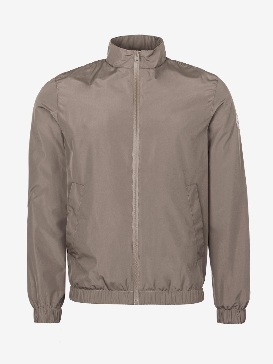 Click/Touch to zoom image Jacket with high collar and long sleeves. Side pockets. Front zipper closure. Elastic at hem and cuffs. Rubber applique detail on sleeve. Foldable pouch in matching fabric.