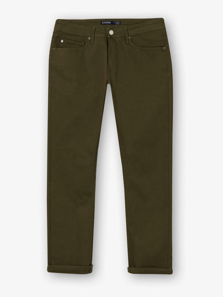 Click/Touch to zoom image Comfort fit pants with five pockets. Front zipper and metal button closure. Model height: 188 cm | Size: 32. Leg size: 32.