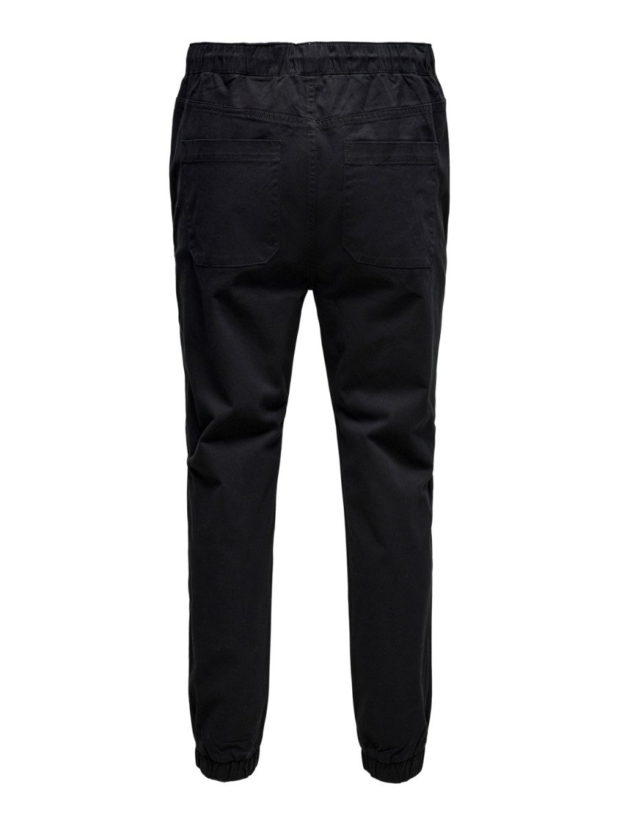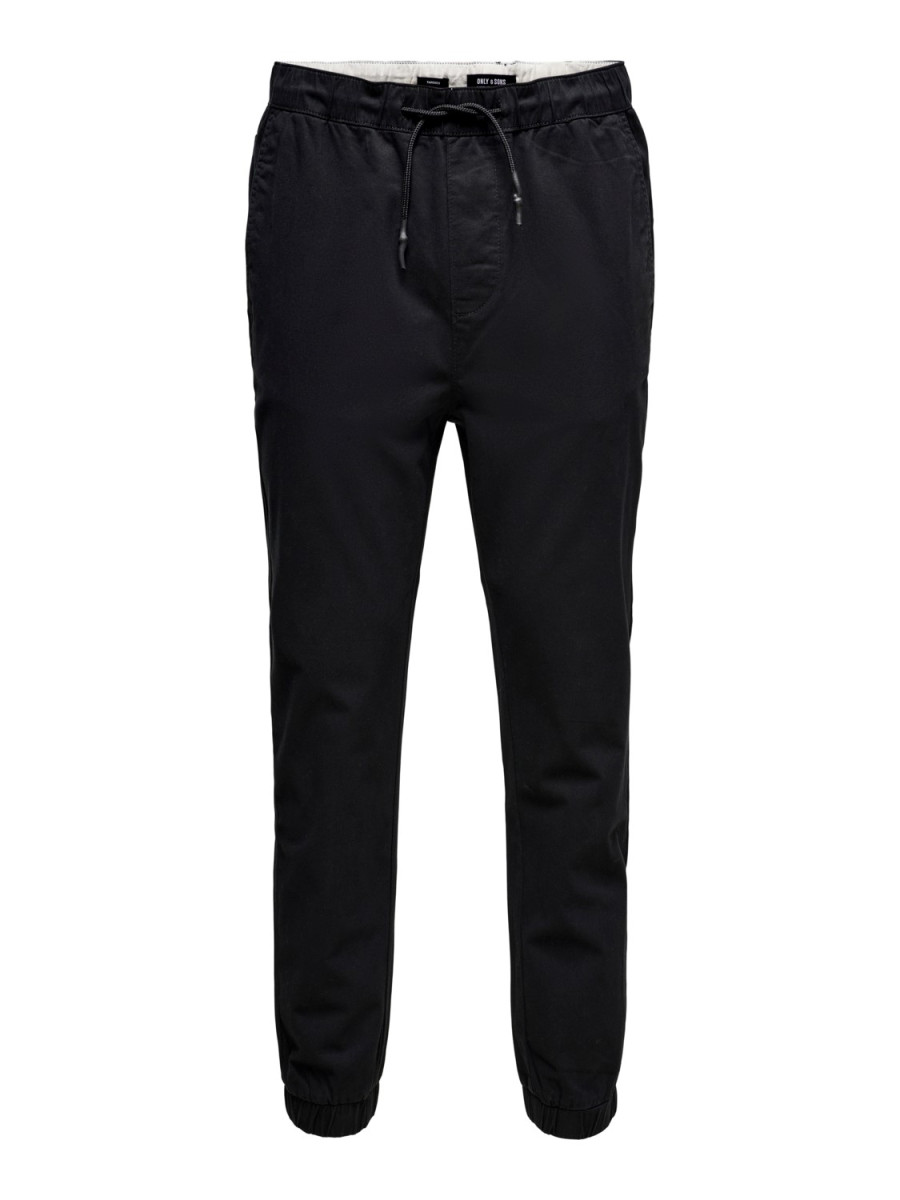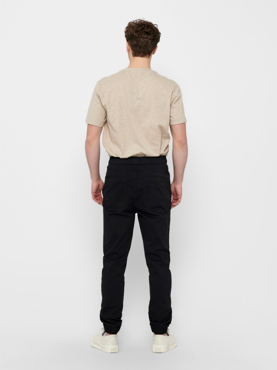 Click/Touch to zoom image - Solid colored chinos. - Drawstring at waist. - 2 side pockets. - Elastic ribs at each leg. - 2 open back pockets. - Inseam: 75 cm in size L. - The model is wearing size L
