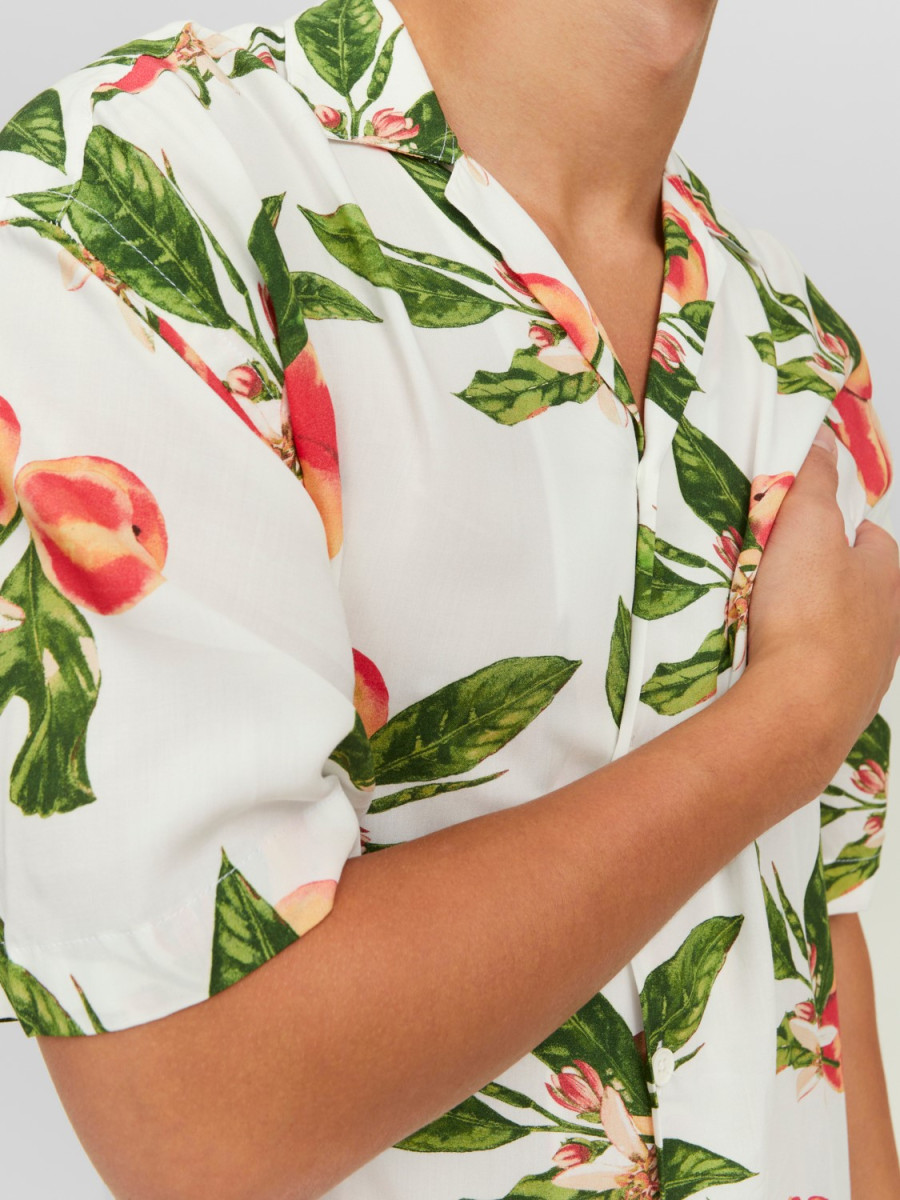 Ampliar -Tipo de detalle : Camisa informal. -Tejido : Popelina. -Cierre/Volante : Cierre con botones. -Detalles adicionales : Aberturas laterales y bajo recto. -Ocasión/Estilo : Camisa ligera y vaporosa para un conjunto veraniego. -Corte : Relajado. -Cuello : Cuello abierto. -Manga : Manga corta (S/S).