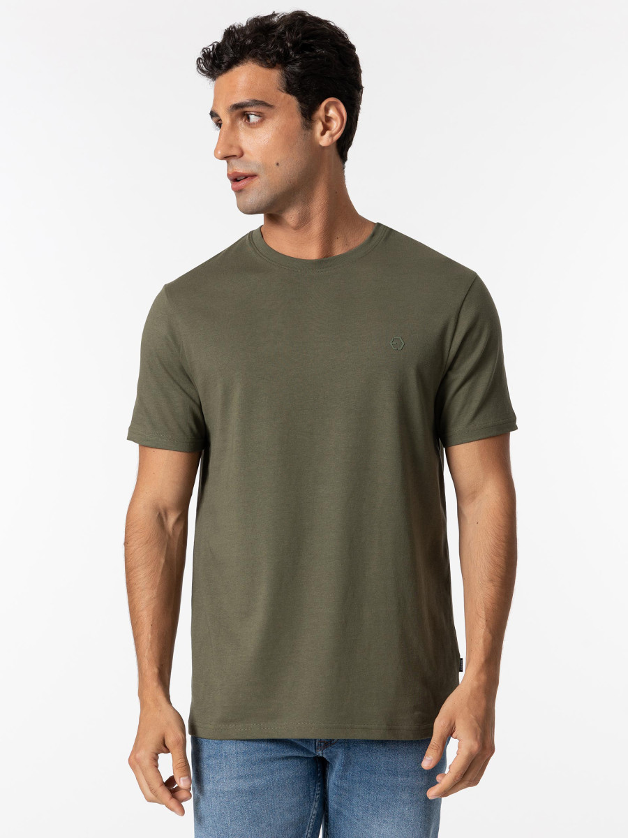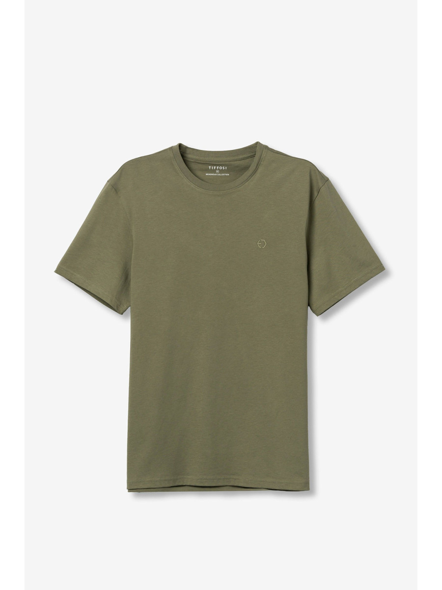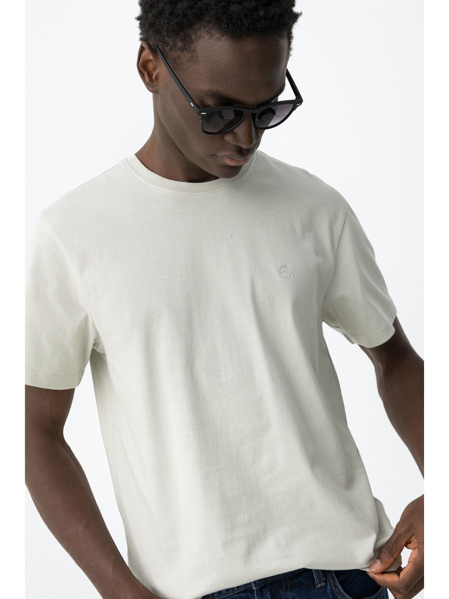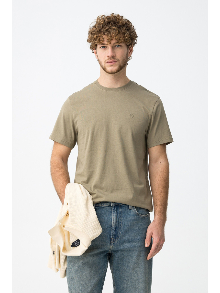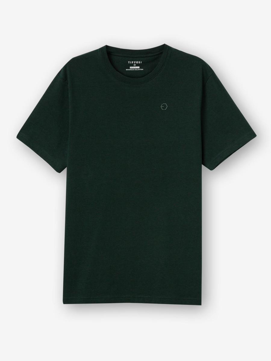 Ampliar Camiseta de cuello redondo y manga corta. Cuello en canalé. Detalle estampado delantero con relieve. Altura Modelo: 188 cm | Talla: M