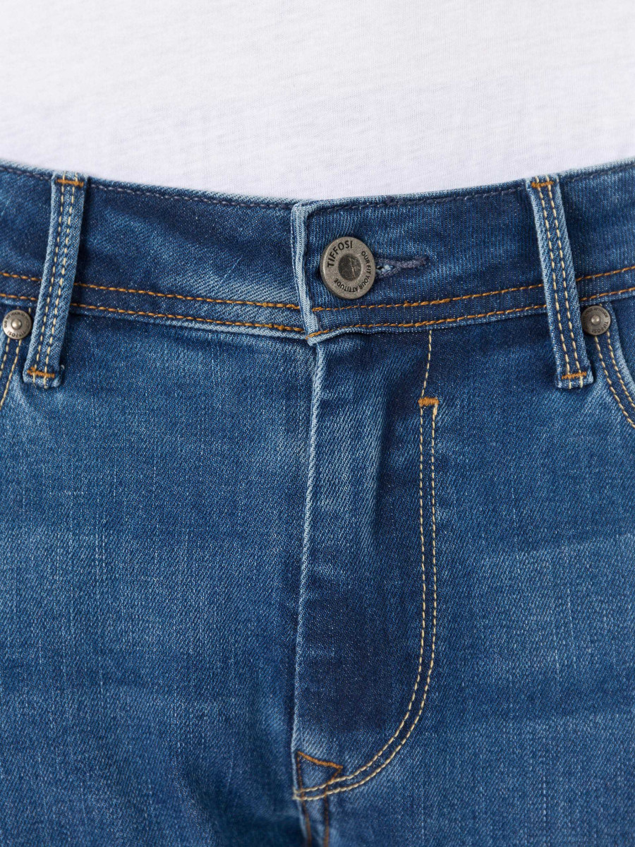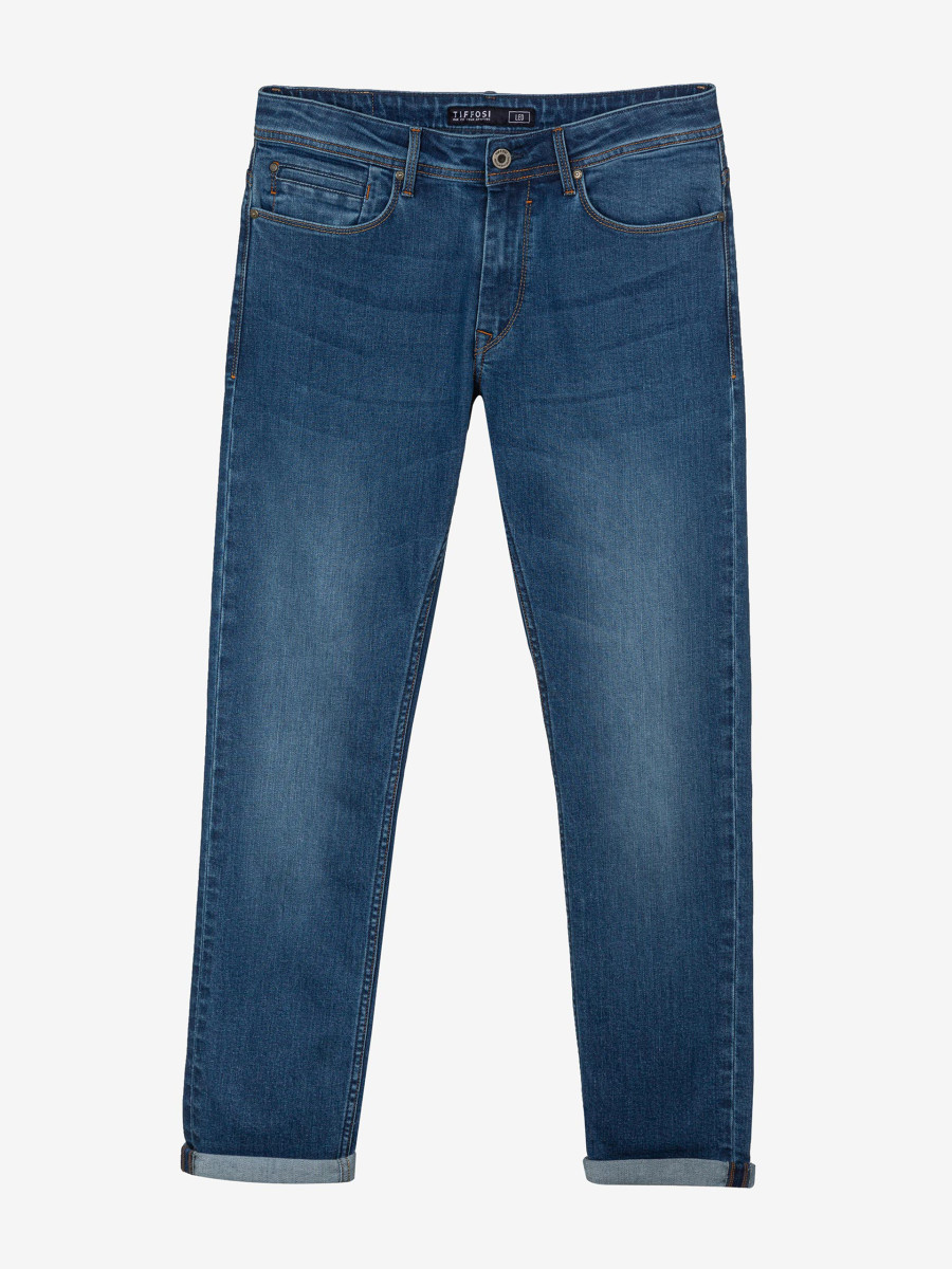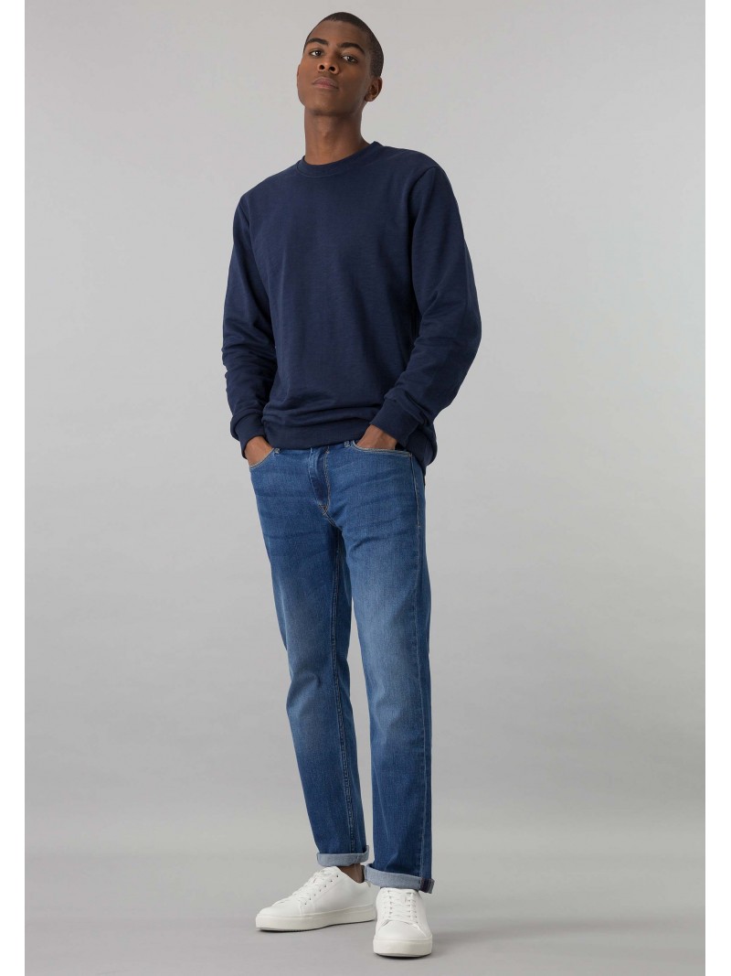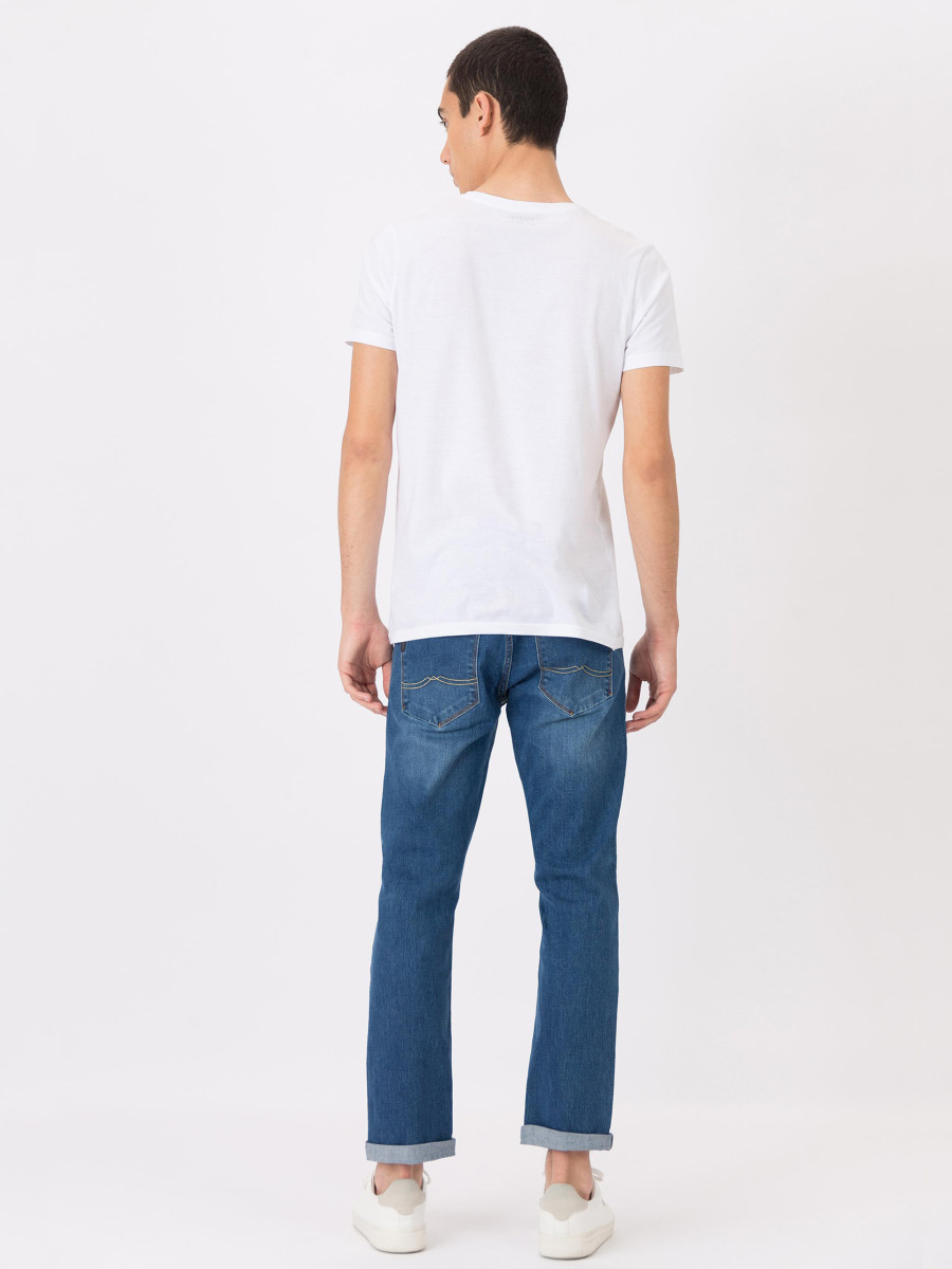Ampliar Vaquero de corte cómodo con cinco bolsillos. Cierre frontal con cremallera y botón metálico. Altura Modelo: 188 cm | Talla: 32
