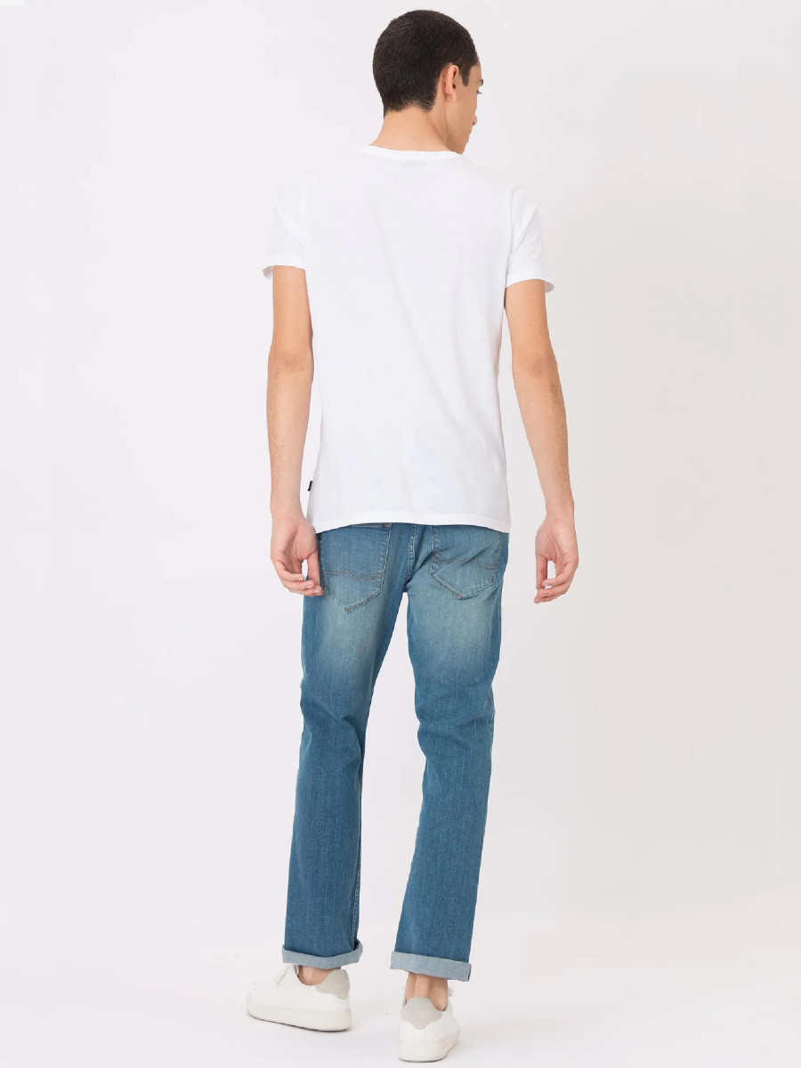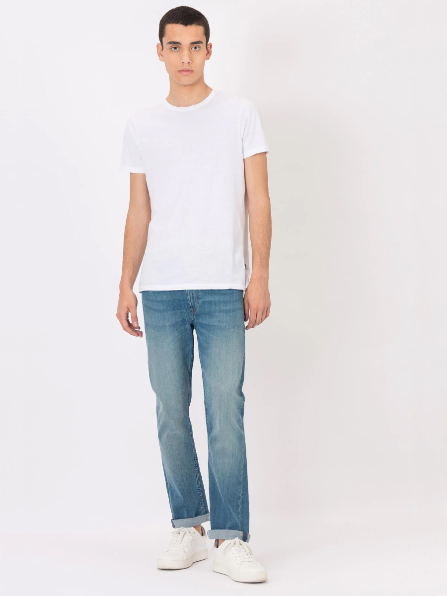 Ampliar Vaquero de corte Confort con cinco bolsillos. Cierre frontal con cremallera y botón metálico. Efecto lavado. Altura Modelo: 188 cm | Talla: 32