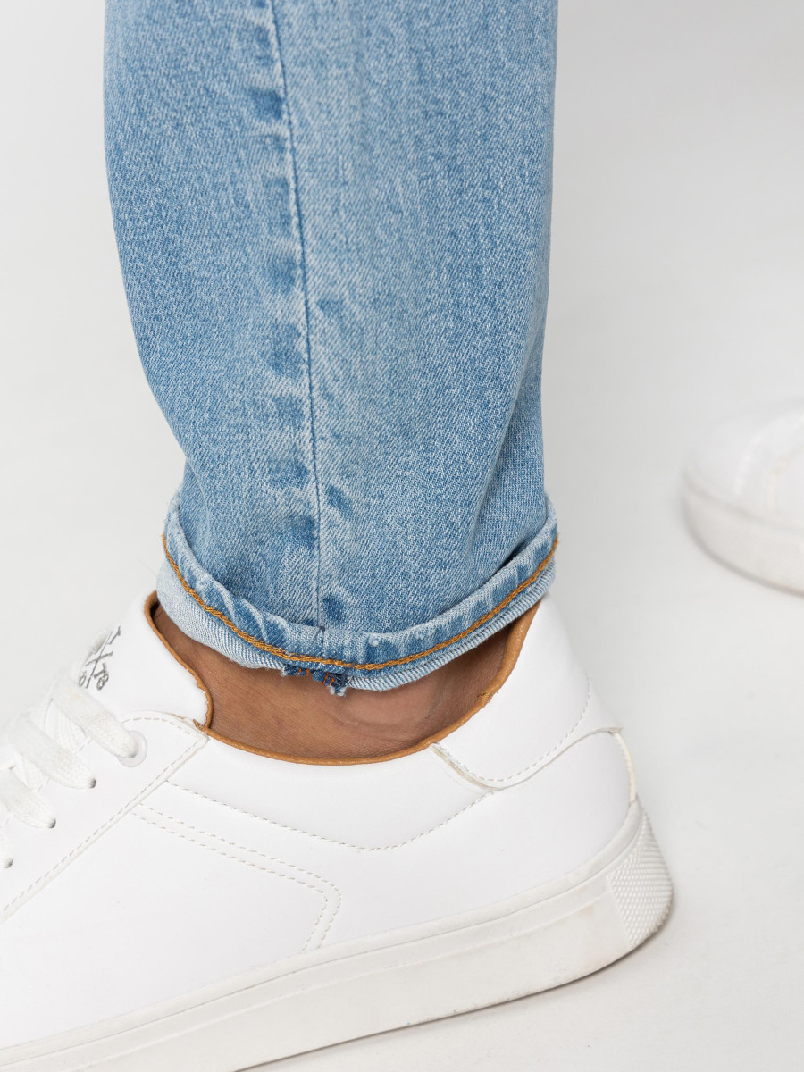 Ampliar Vaquero con cinco bolsillos. Cierre frontal con cremallera y botón metálico. Tejido con rotos y rasgado. Efecto lavado. Azul claro. Altura Modelo: 188 cm | Talla: 32.