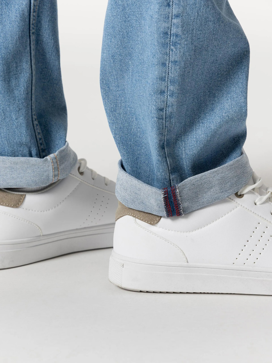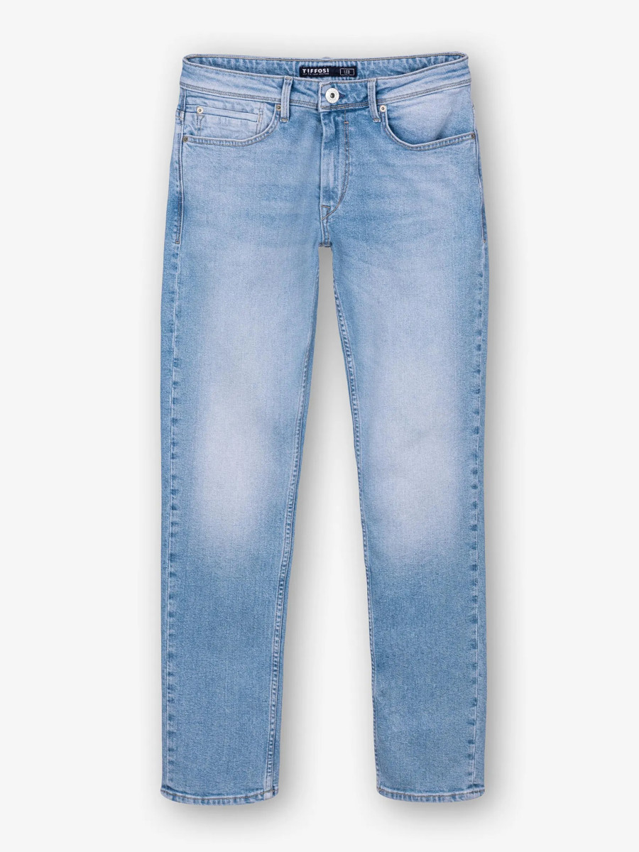 Ampliar Vaquero de corte confort con cinco bolsillos. Cierre frontal con cremallera y botón metálico. Altura Modelo: 188 cm | Talla: 32